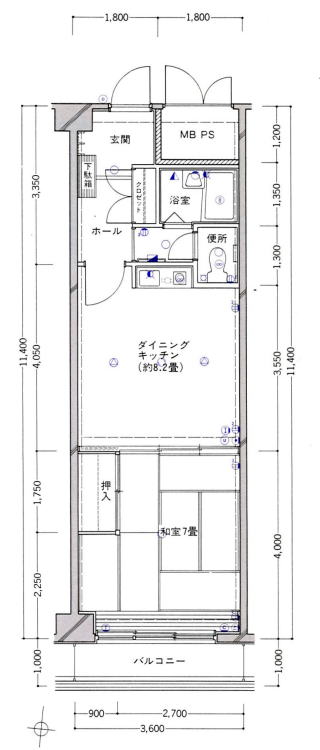 間取りは1DKで、ダイニングキッチン8.2帖、和室7帖の間取りです。