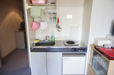 ミニキッチン設備の様子。 コンロは電気ヒーター式、給湯は深夜電力による電気温水器です。 ガスはありません。 |
