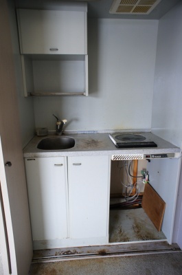 キッチン設備の様子。 給湯は深夜電力による電気温水器(使用可否不明)で、ガスはありません。 |
