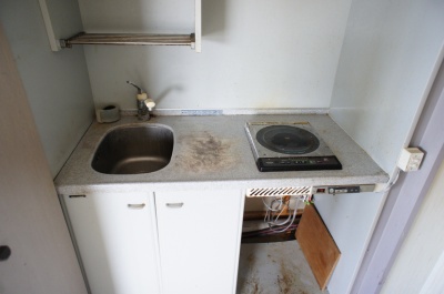 ミニキッチンのコンロはIH式で給湯は深夜電力による電気温水器ですが、現在の使用可否は不明です。