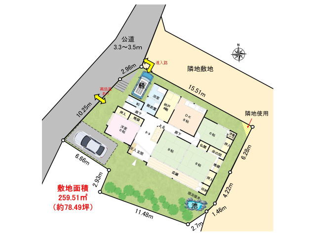 | 面積 | 土地:宅地 259.51u(約78.49坪)、 農地 1727u(約522.38坪) 建物:1階118.93u 2階30.63u 延149.56u(約45.23坪) |