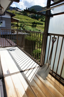2階南向きのベランダ。 2階のそれぞれのお部屋に繋がっています。 屋根や囲いも設置されているのは特徴です。 |