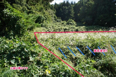 農地の東側の様子。 農地は段状の高低差があります。 面積は1727u(約522.38坪)で広いため、家庭菜園以上の利用方法を検討する必要があります。 出荷を視野に入れた営農計画が必要な面積です。 |
