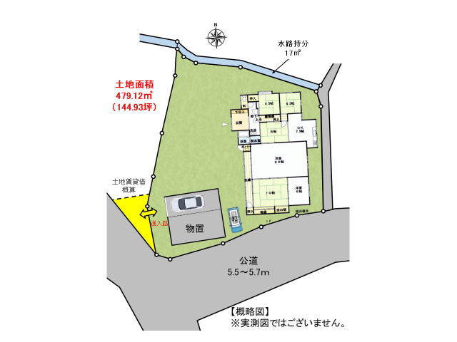 敷地面積は2筆合計496.12u(約150.06坪)で、古民家と離れの倉庫があります。