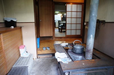 玄関の様子。 建物は昭和3年築の古民家となっています。 薪ストーブがあり、冬は玄関で扇風機を回すと、家中温かいです。 薪ストーブと薪はお譲りできます。ご相談ください。 |