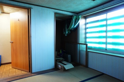 一旦玄関まで戻り、玄関からすぐの4.5帖和室。 こちらも床が傷んでおり、歩くと凹みます。 |