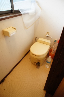 トイレ。 現状は汲取式(簡易水洗)です。 下水道は敷地内の引き込みあありません。 |