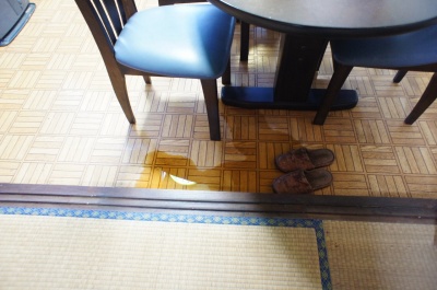 雨漏りのような跡。 写真撮影時は実際に床が濡れておりましたが、壁や天井などにそのような跡がなく、詳細は不明です。 |