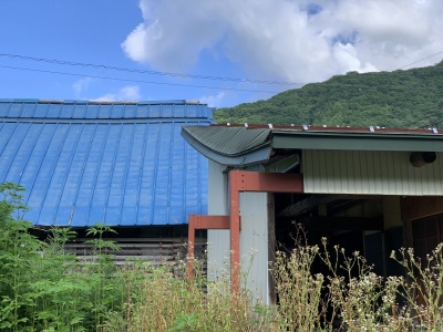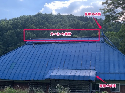 東側からの屋根の様子。 冬季のメンテナンス不足により屋根が破損しています。 雪下ろしなどをしなかったメンテナンス不足による雪の重みの影響と考えられる傷みや全体的な老朽化が進んでいる状態です。 |