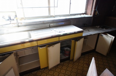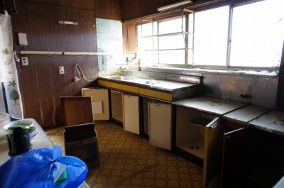 キッチン設備の様子。 築年月、空き家期間相応の老朽化が見受けられます。 2009年から空き家ですので、配管類を含めたすべての設備の再使用可否は不明です。 |