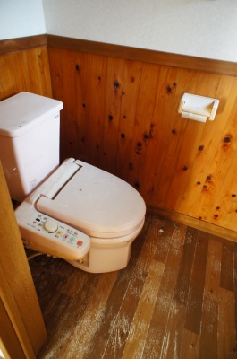 トイレ。 くみ取り式で、下水道管がない(道に配管がない)ため、接続することはできません。 水まわり設備の再利用可否は不明です。 |