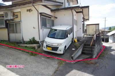 駐車場は建物前に軽自動車が1台駐車可能なものの、傾斜地なうえ長さが短く、さらに隣地を通らないとアクセスできません。