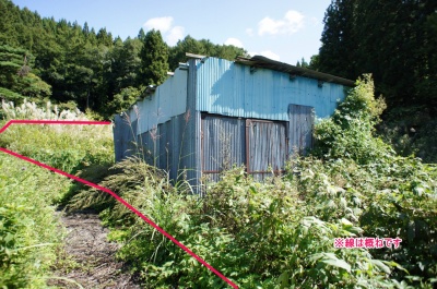 農地内には農機具、資材置き場があります。 一部半壊しています。 |