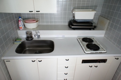 キッチン設備は給湯は深夜電力による電気温水器、コンロは電気ヒーター式コンロでガスはありません。
